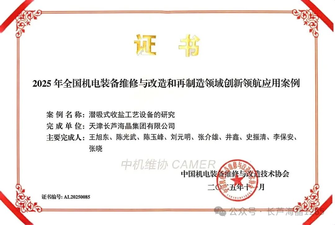 近日,從在河北唐山舉辦的2025中國裝備運維與改造大會上傳來喜訊,公司“潛吸式收鹽工藝設備的研究”成果榮獲“2025年全國機電裝備維修與改造和再制造領域創新領航應用案例”獎項,第一分公司被選樹為“‘2025年行業領域劉元明鹽業設備研發大工匠’建設單位”,劉元明同志被選樹為“‘劉元明鹽業設備研發大工匠工作室’領隊工匠”;海光公司被選樹為“‘2025年行業領域廉洪生氯化鈉生產工藝大工匠工作室’建設單位”,廉洪生同志被選樹為“‘廉洪生氯化鈉生產工藝大工匠工作室’領隊工匠”。
